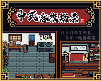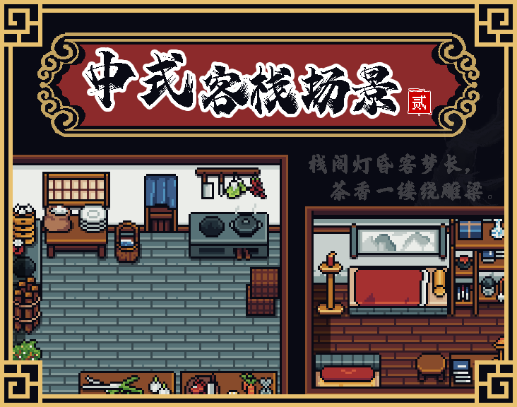 The resources include a 16*16 pixel 2D Chinese ancient-style inn scene presented in a top-down perspective.